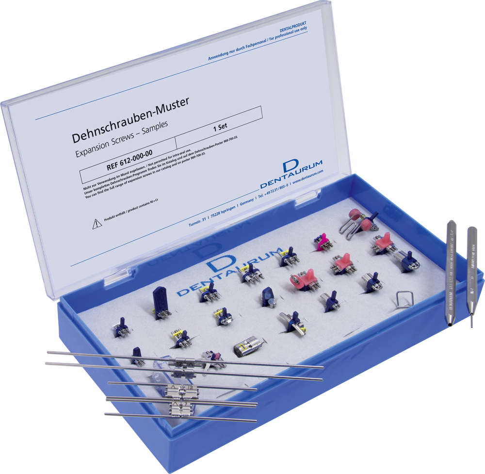 The kit includes a selection from Dentaurum's large range of expansion screws and is for promotional and demonstration purposes only. The content of this kit is not certified for use on patients! Filled with 27 expansion screws that are on stock, 2 expansion screw keys and 1 universal bending key. 1 set = 30 pieces.